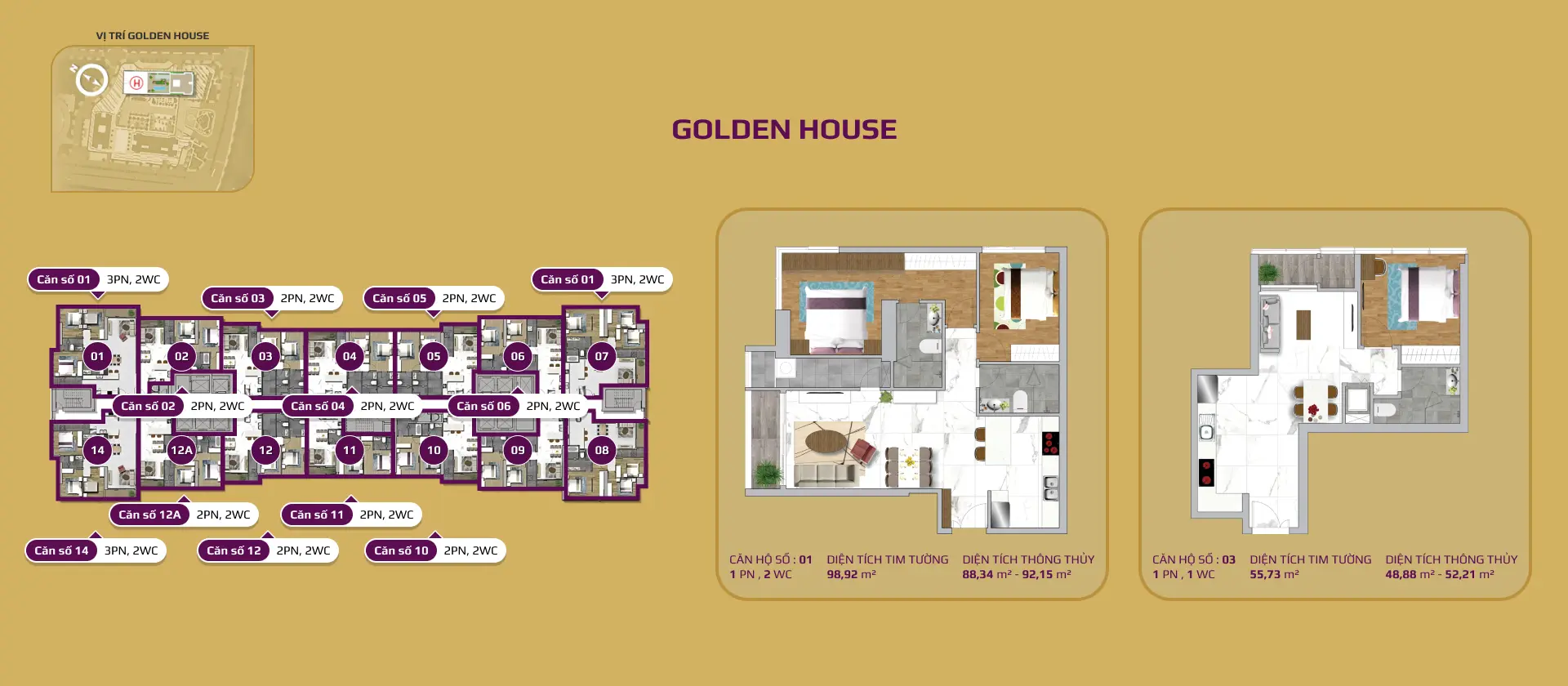 | 1 phòng ngủ | 52–56 m² | 8 – 9.5 tỷ |